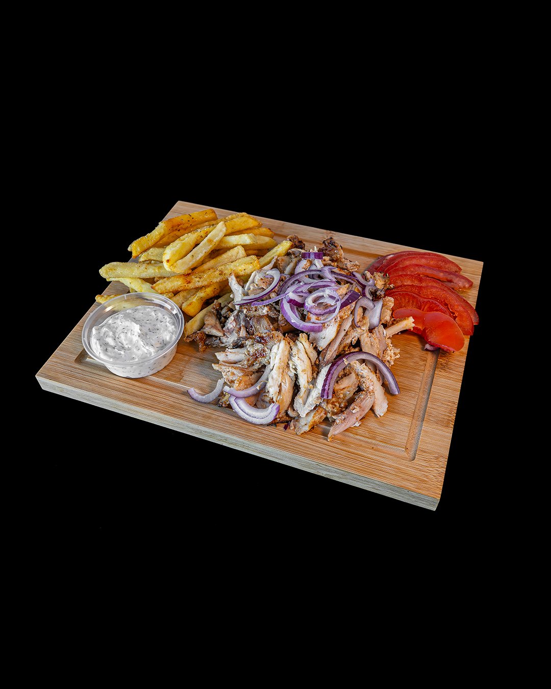 Chicken gyro wrapped in fluffy pita, loaded with fresh veggies, crispy fries & creamy tzatziki — the perfect Greek bite!