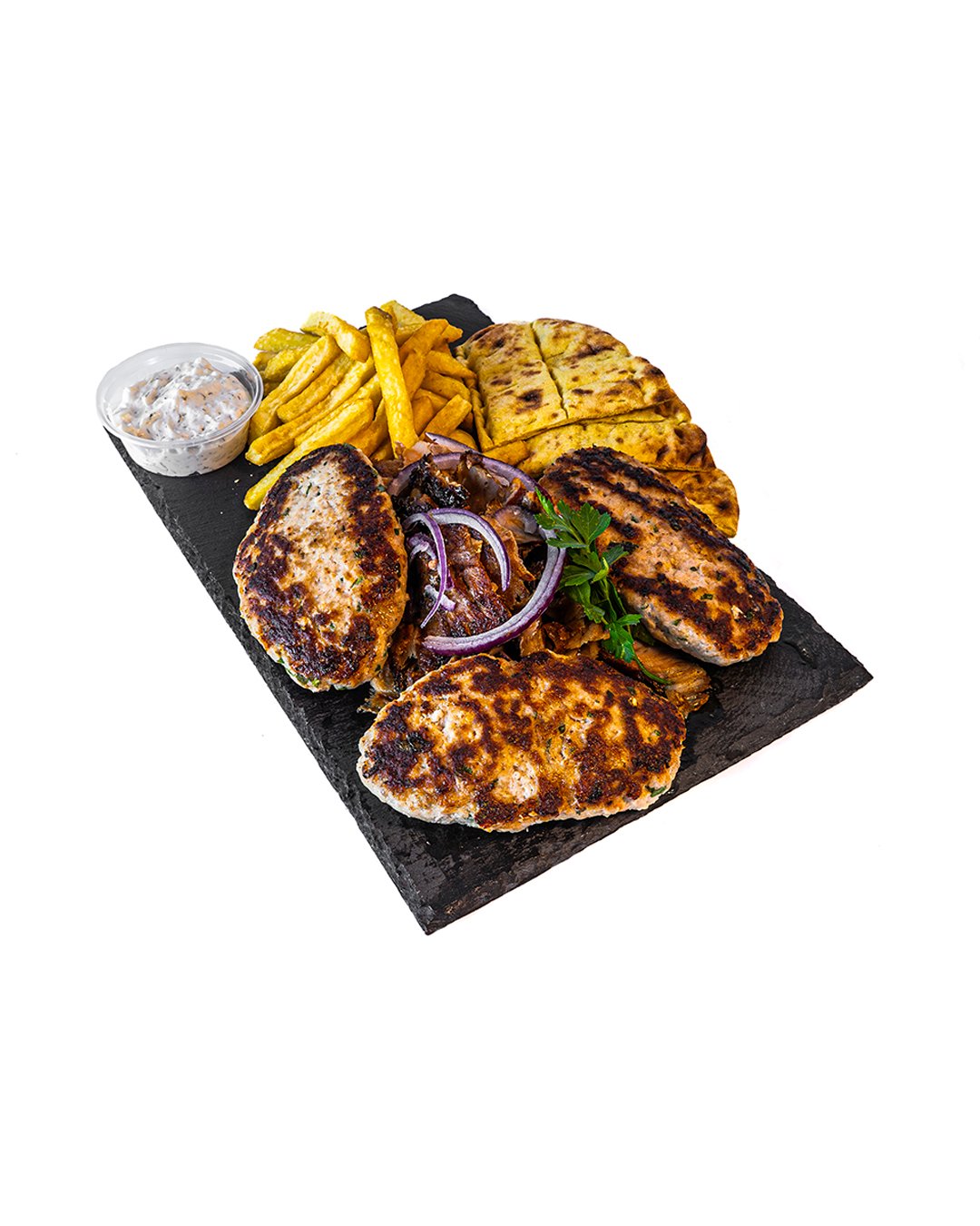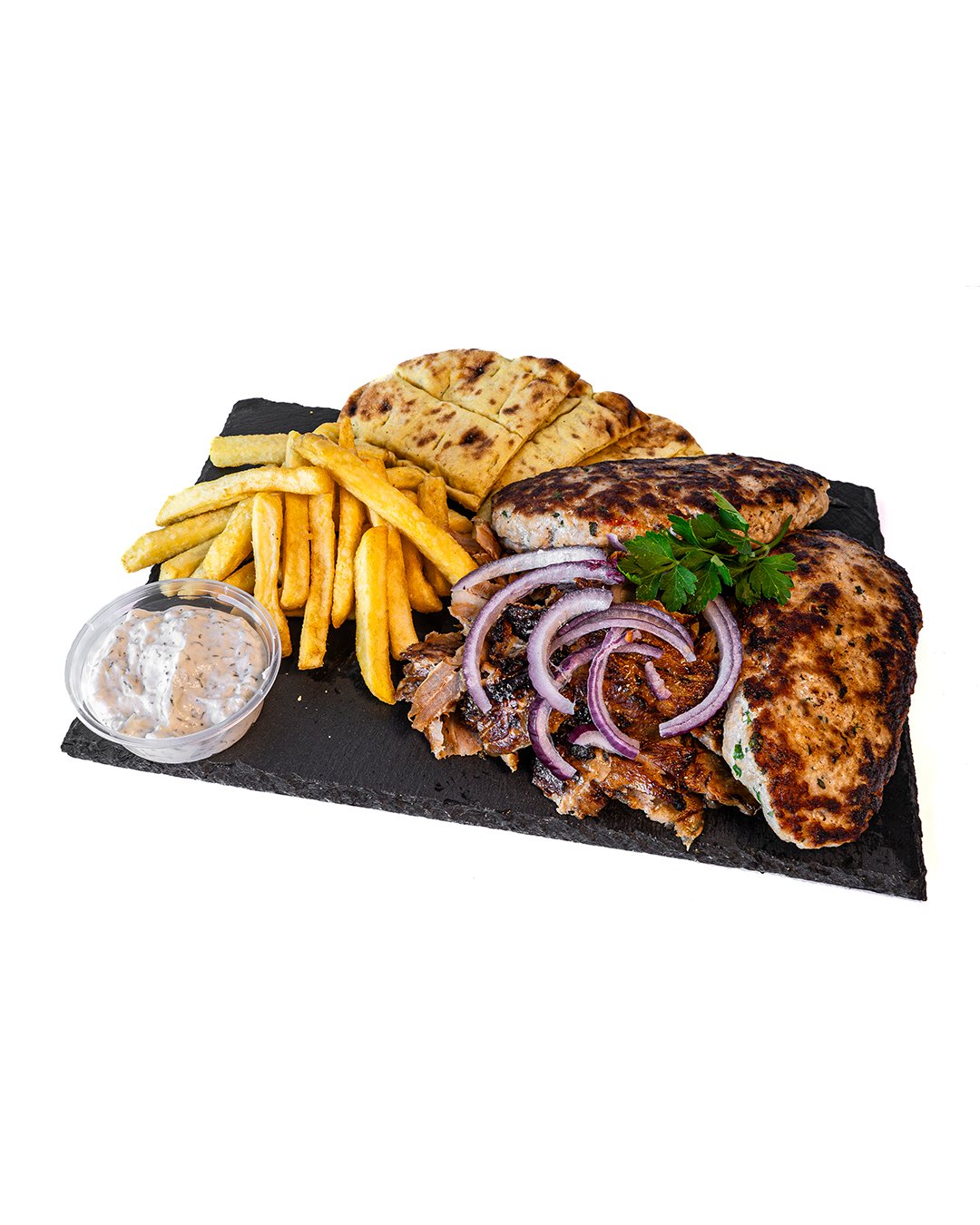 2 Grilled Greek beef patties stuffed with feta cheese bursting with flavor! Served with pork gyros, crispy fries, and our signature sauce 🥣. A hearty and delicious classic! 🇬🇷