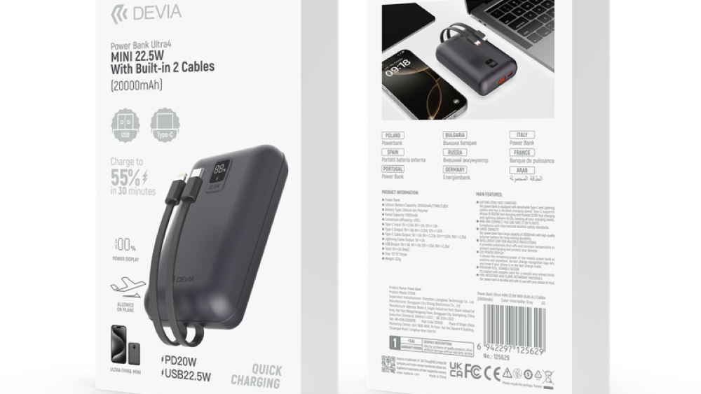 20,000mAh Powerbank Ultra 4 Mini 22.5w with Built-in 2 Cables