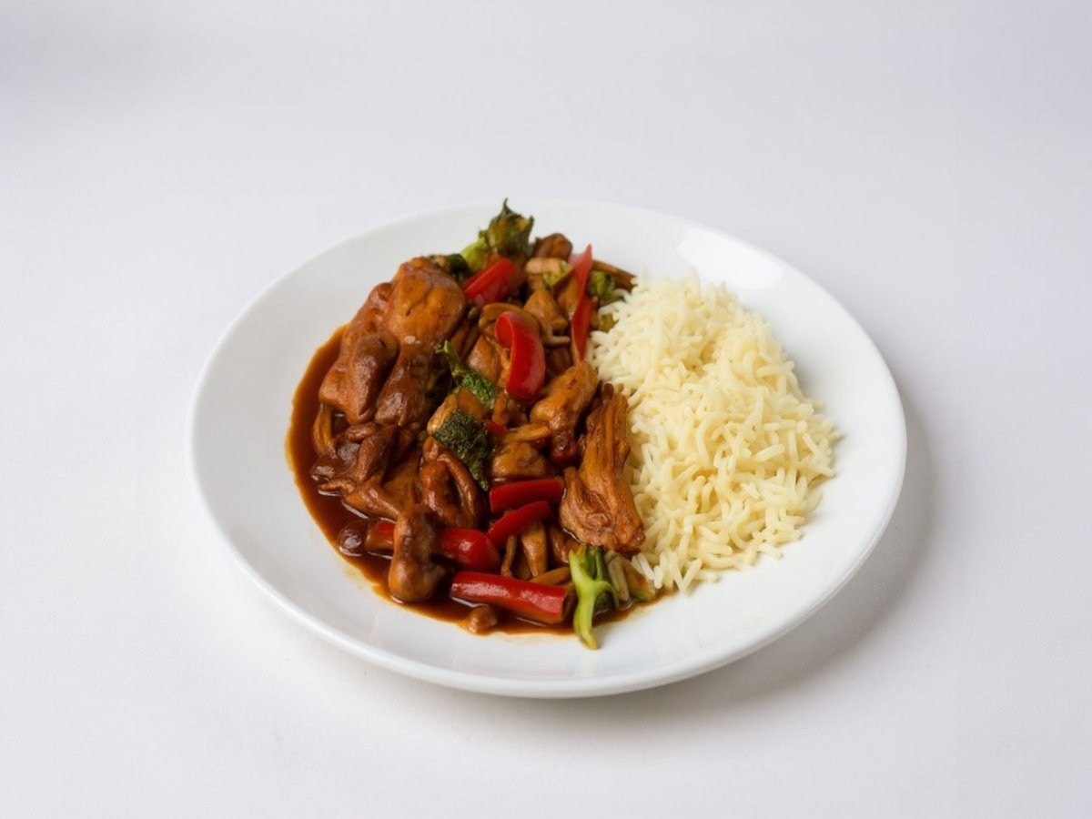 Stekt kyllinglår med soyasaus, løk, brokkoli, paprika og vårløk.