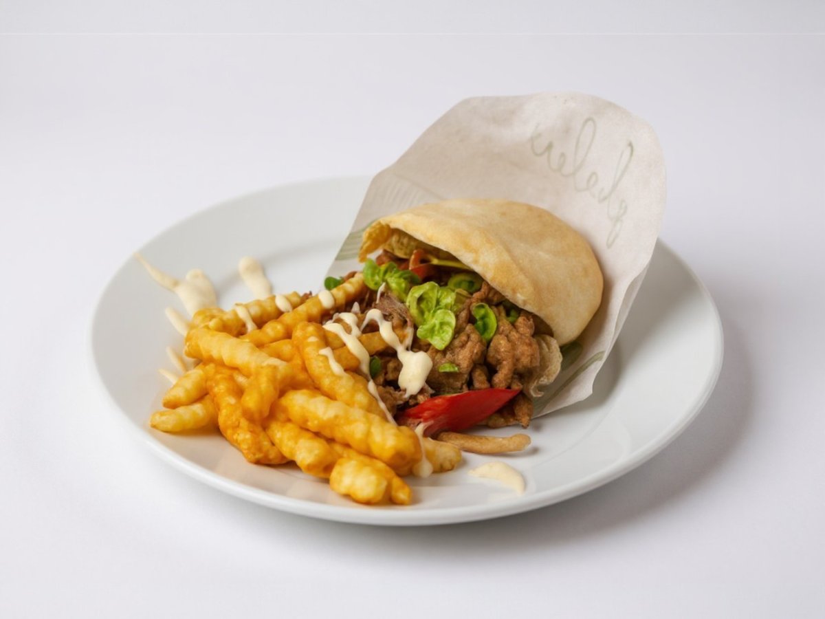 Pitabrød med kylling eller biff, salat, agurk, paprika, vårløk, tomat og mild saus.