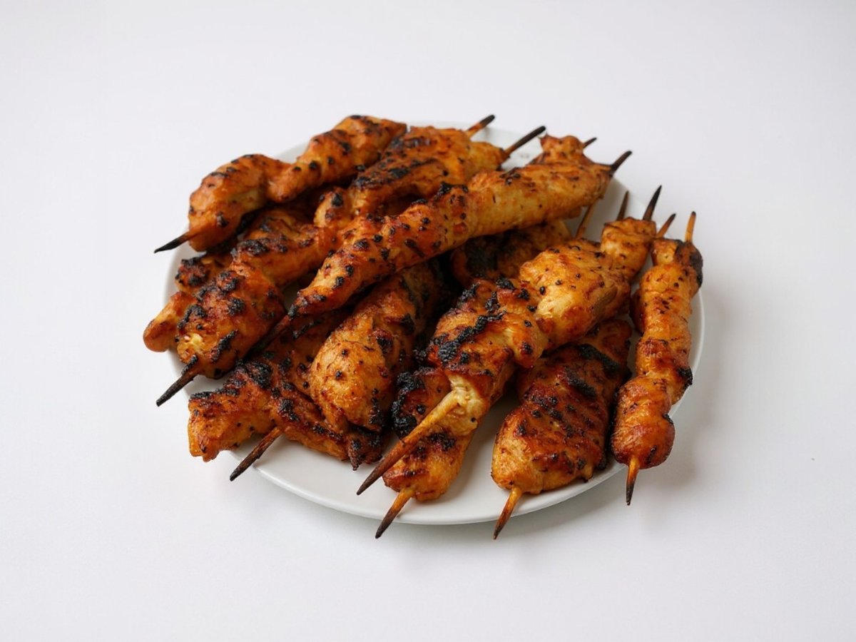 Grillet spyd med karripulver, paprika, løk, kokoskrem, kyllingkrydder og ketchup.