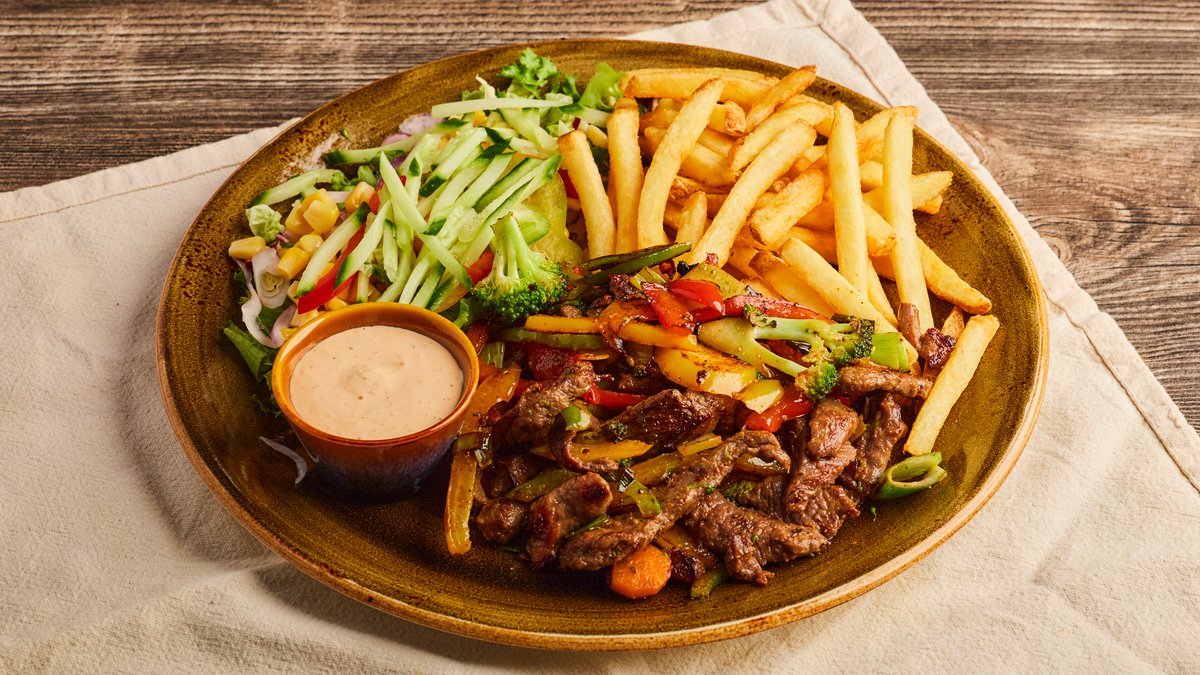 Marinerte biffstrimler og vår egen grønnsaksblanding. Serveres med pommes frites, blandet salat og dressing.