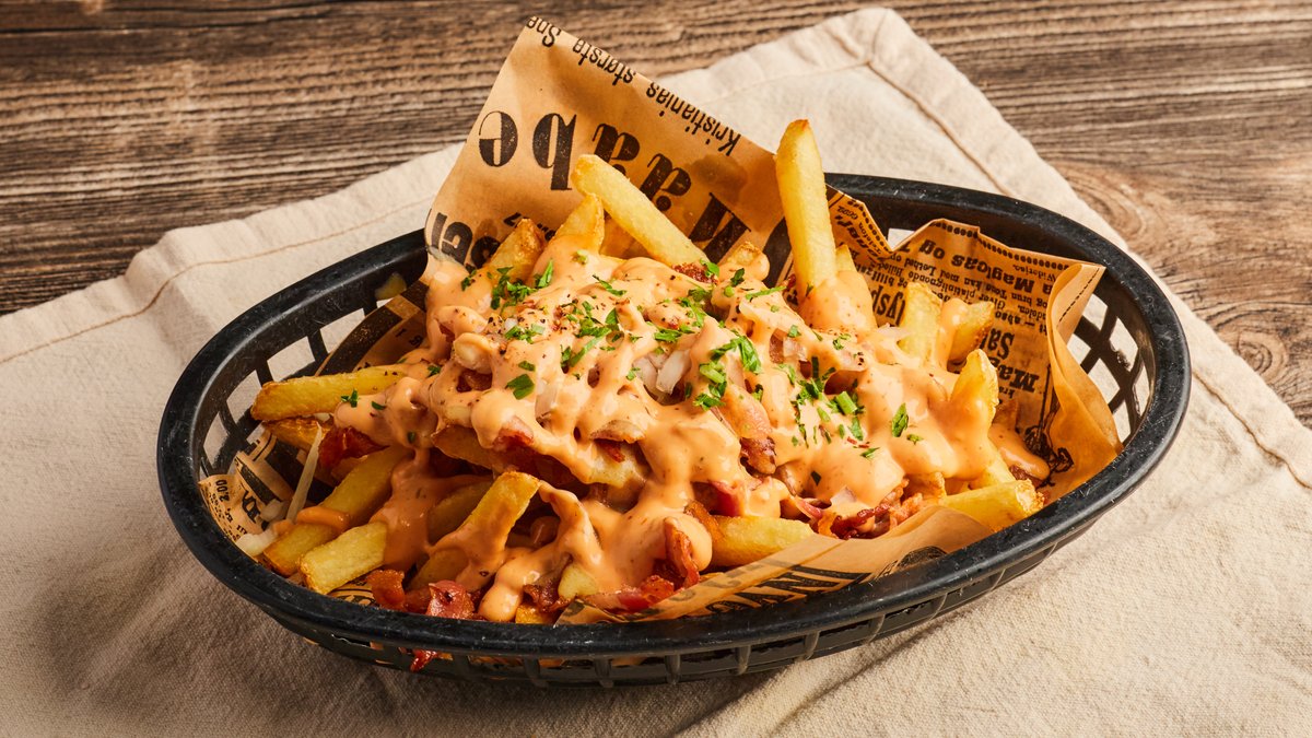 Pommes frites med bacon, løk, UNO-dressing og varm ostesaus.