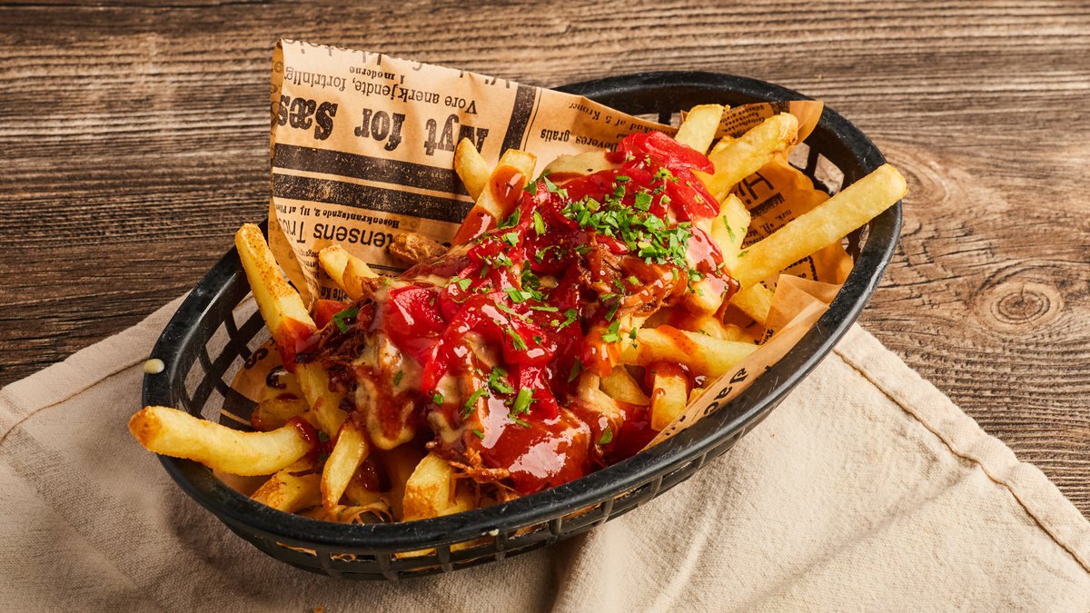 Pommes frites med pulled pork, BBQ-saus, syltet rødløk og varm ostesaus.