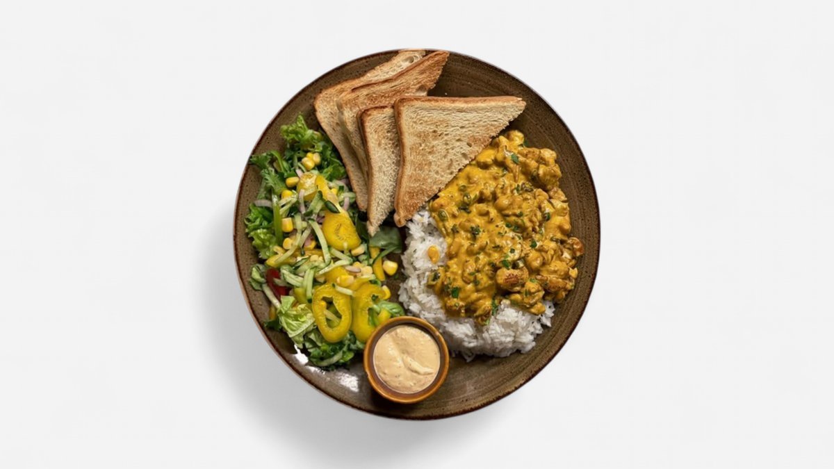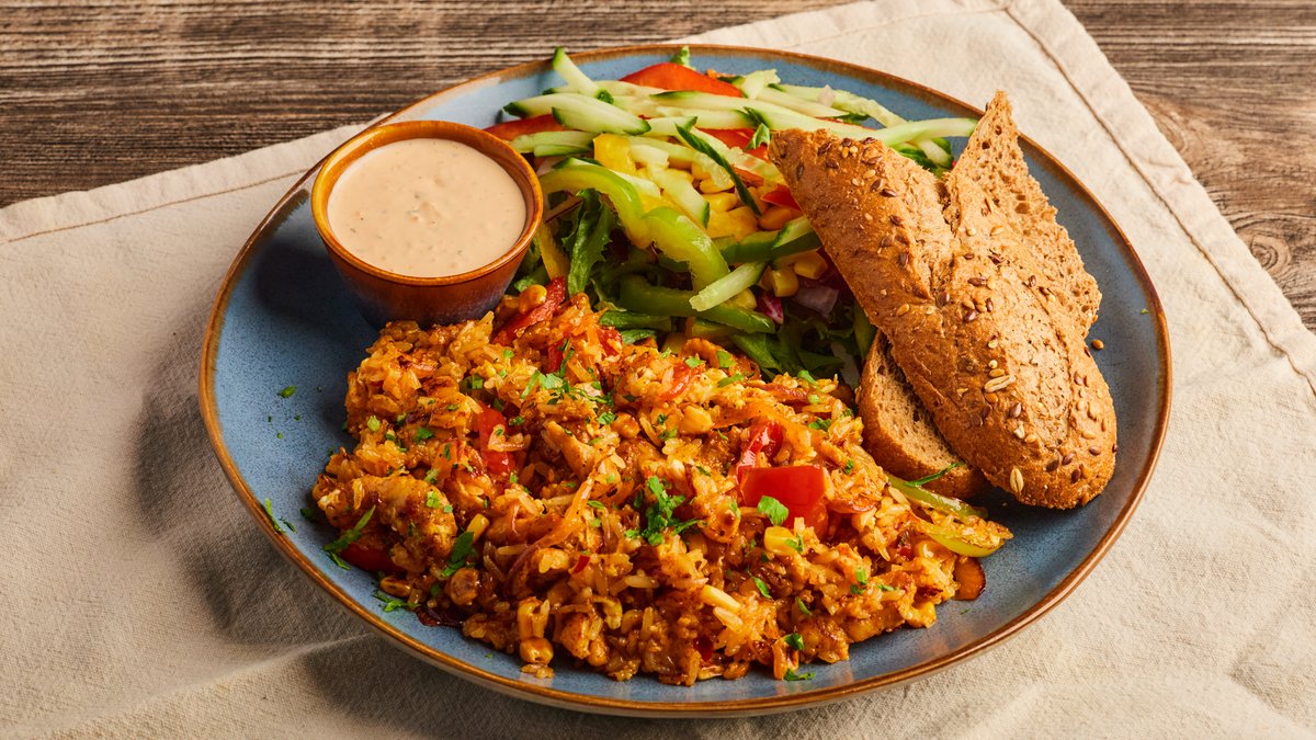 Marinert kylling, rødløk, mais, paprika, søt chili, egg og stekt ris. Serveres med blandet salat, dressing, grov baguett og smør.