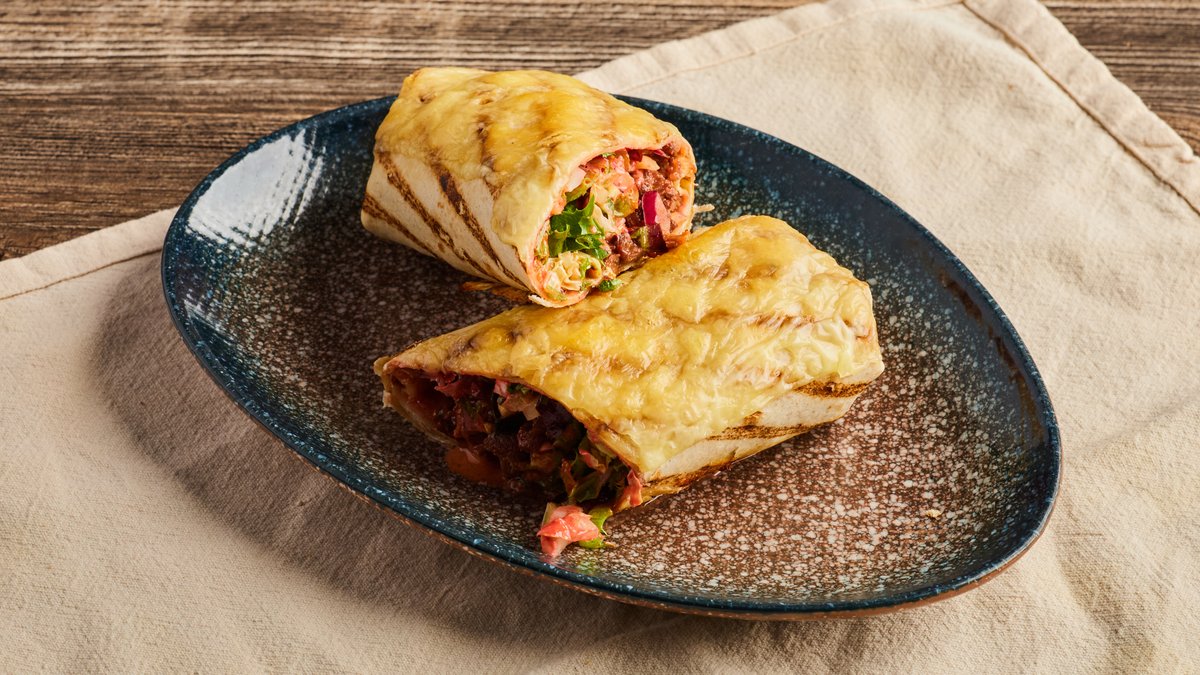 Tortillafylt lefse med rømme, søt chilisaus, salat, agurk, pannestekt løk, paprika, mais og vegetarstrips. Gratineres med ost.