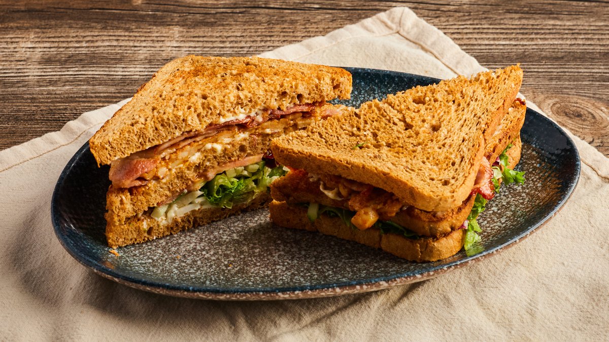 Marinert kylling, bacon, majones, tomat og agurk i tre saftige skiver grovbrød.