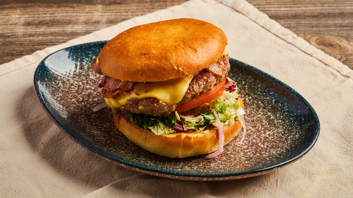 Hamburger med UNO-dressing, salat, rødløk, tomat, sylteagurk, norsk cheddar og bacon. Velg størrelse.