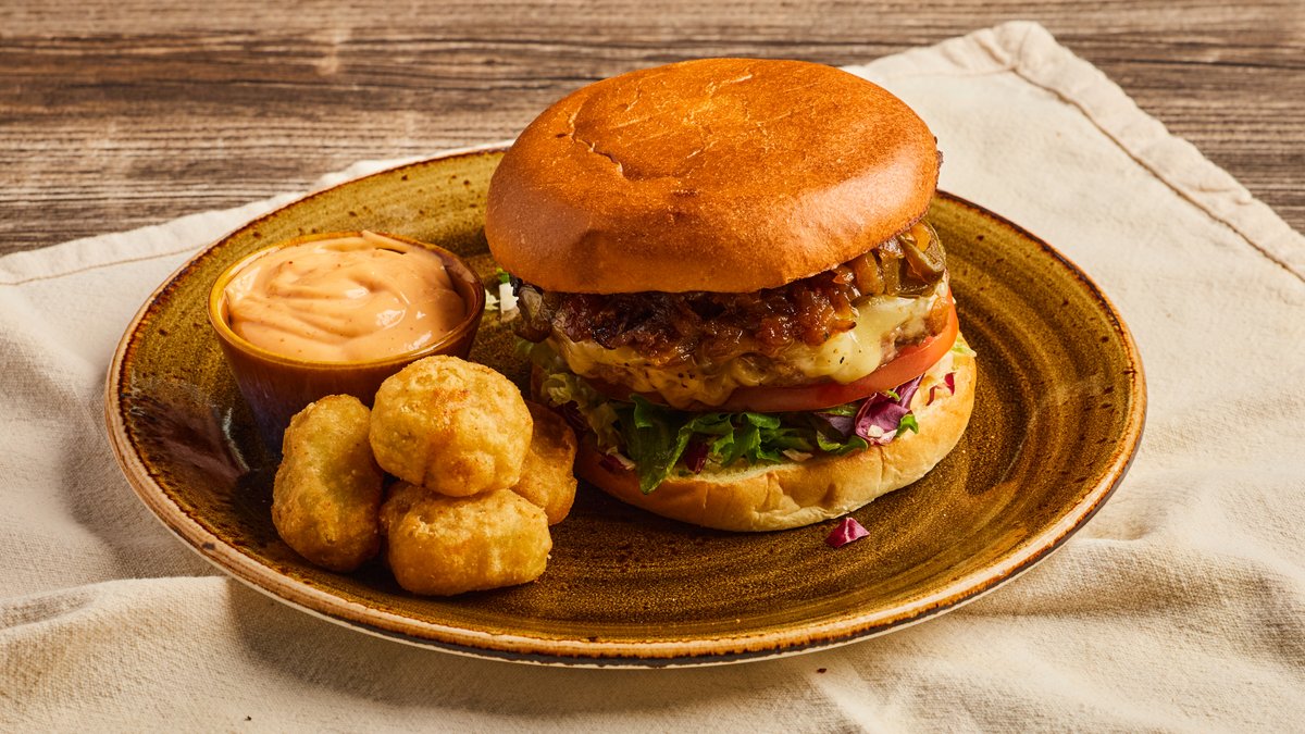 Hamburger med chilimajones, salat, tomat, jalapeños, pepperost og karamellisert løk. Serveres med chilimajones og 4 chili cheese nuggets.