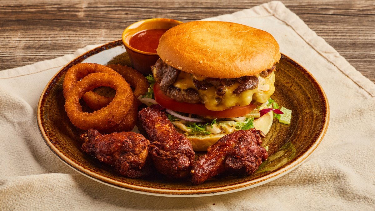 Hamburger med UNO's hvitløksdressing, salat, rødløk, tomat, sylteagurk, norsk cheddar og marinert biffkjøtt. Serveres med BBQ dip, 3 løkringer og 3 buffalo wings. Velg størrelse.