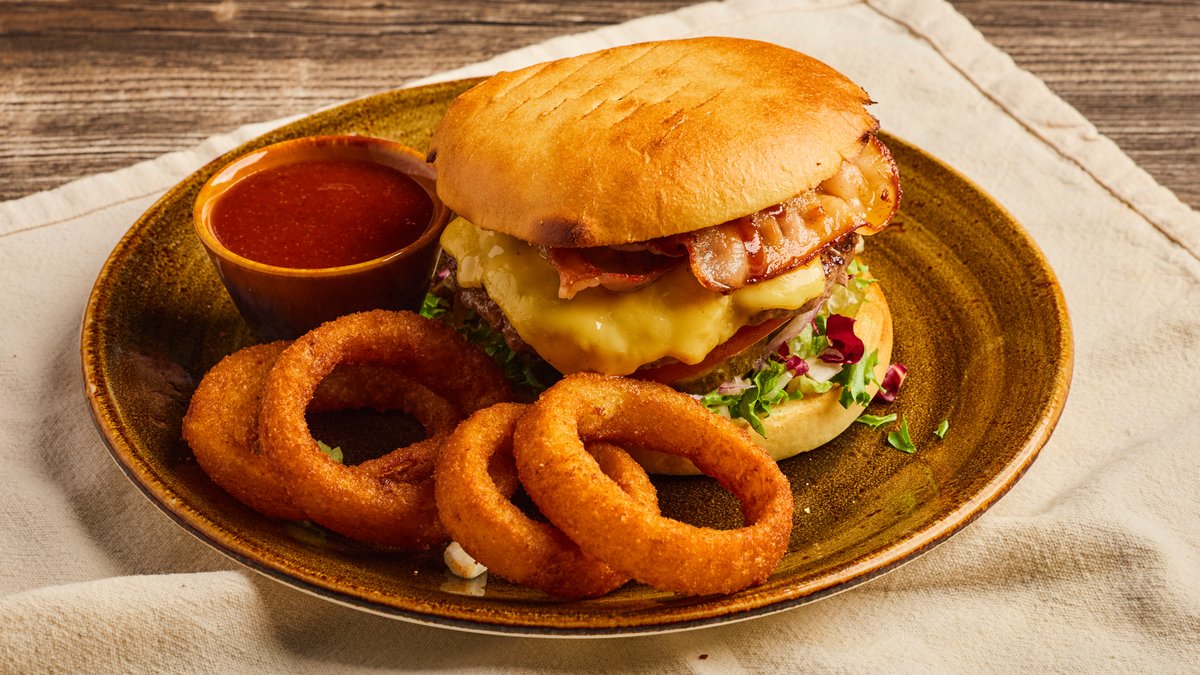 Hamburger med UNO's Jack Daniels BBQ-dressing, salat, rødløk, tomat, sylteagurk, norsk cheddar og bacon. Servere med BBQ-dip og 4 løkringer. Velg størrelse.