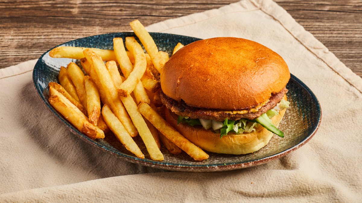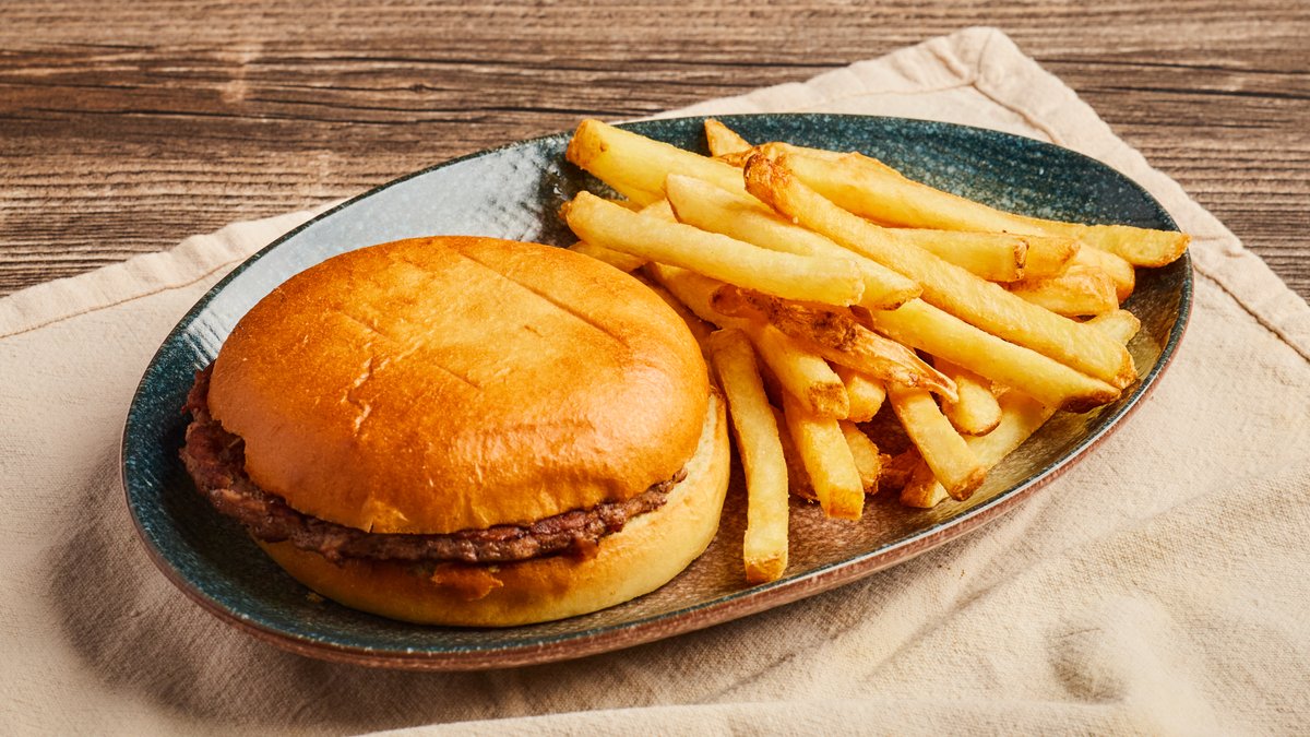 Enkel burger med brød. Serveres med pommes frites.