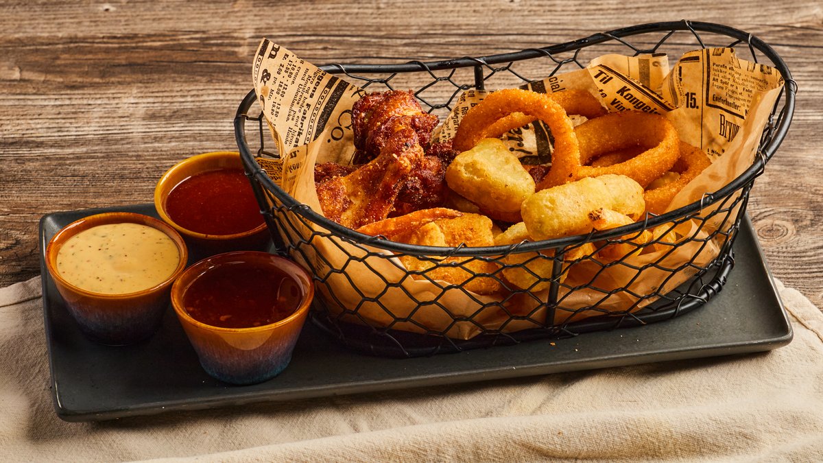 4 stk. buffalo wings, 4 stk. chili cheese, 4 stk. løkringer, 4. stk chicken nuggets. Serveres med pommes frites og BBQ-dip, hvitløksdip og søt chili-dip.