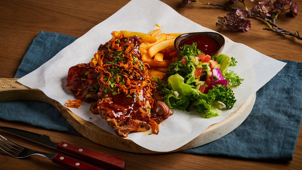 Saftige spareribs servert med pommes bistro, grillede grønnsaker og BBQ saus.