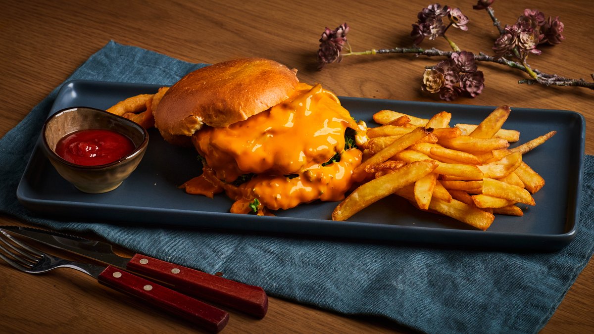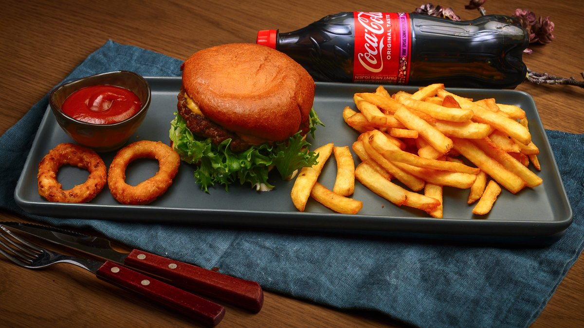 Serveres med crispy salat, bacon, cheddar, pommes frites og valgfri 0,5l brus.