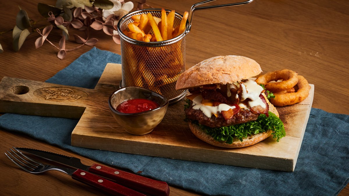 160 g. hjemmelaget burger. Serveres i vårt signaturbrød med trippel ost, bacon, sprøstekt løk, amerikansk jalapeño, ostesaus, tomat, løk, salat, løkringer og pommes bistro.