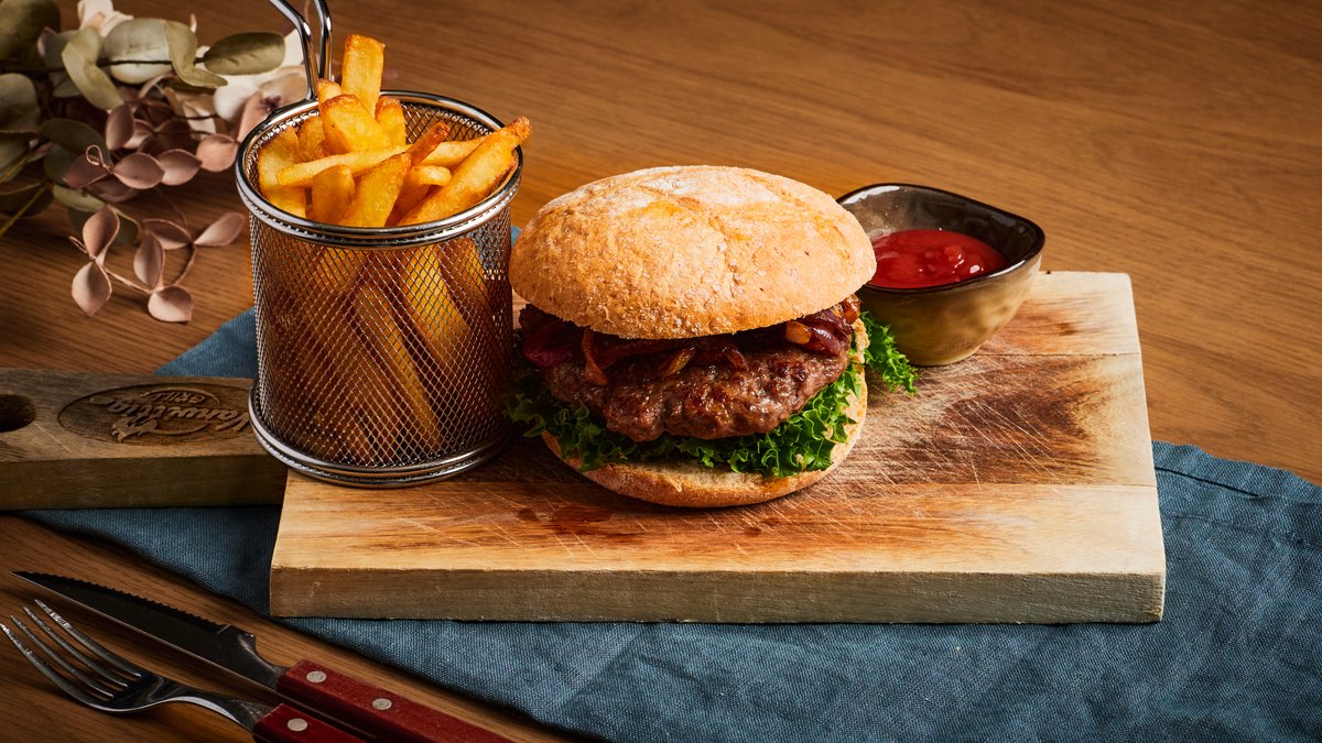 160 g. hjemmelaget burger. Serveres i vårt signaturbrød med salat, tomat, løk, agurk, karamellisert løk, hvitløksdressing og pommes bistro.
