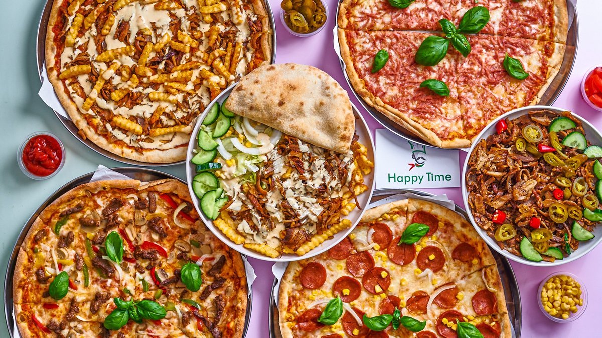 DEILIG, SAFTIG KEBABKJØTT OG HJEMMEBAKT BRØD. Det er Happy Time det! Stort utvalg av kebab, italiensk pizza, salater og hamburgerretter.