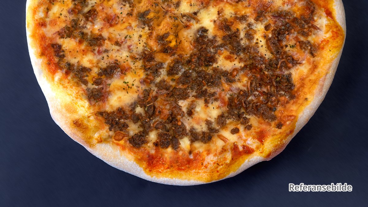 Innbakt pizza med tomatsaus, ost, kjøttsaus og løk.