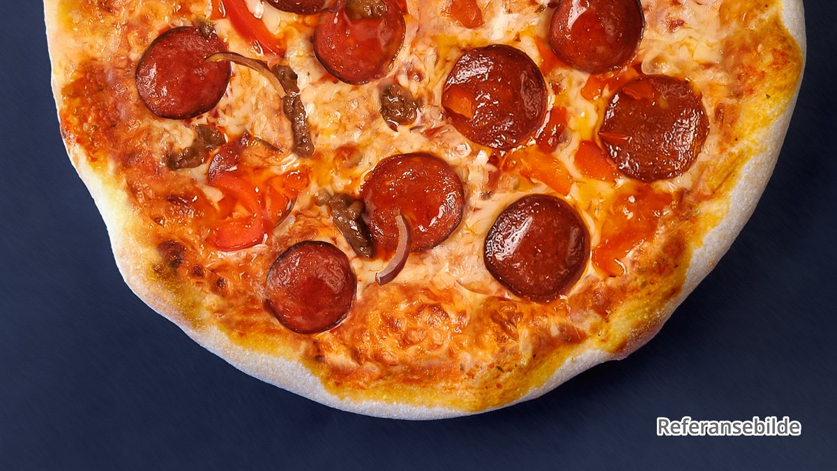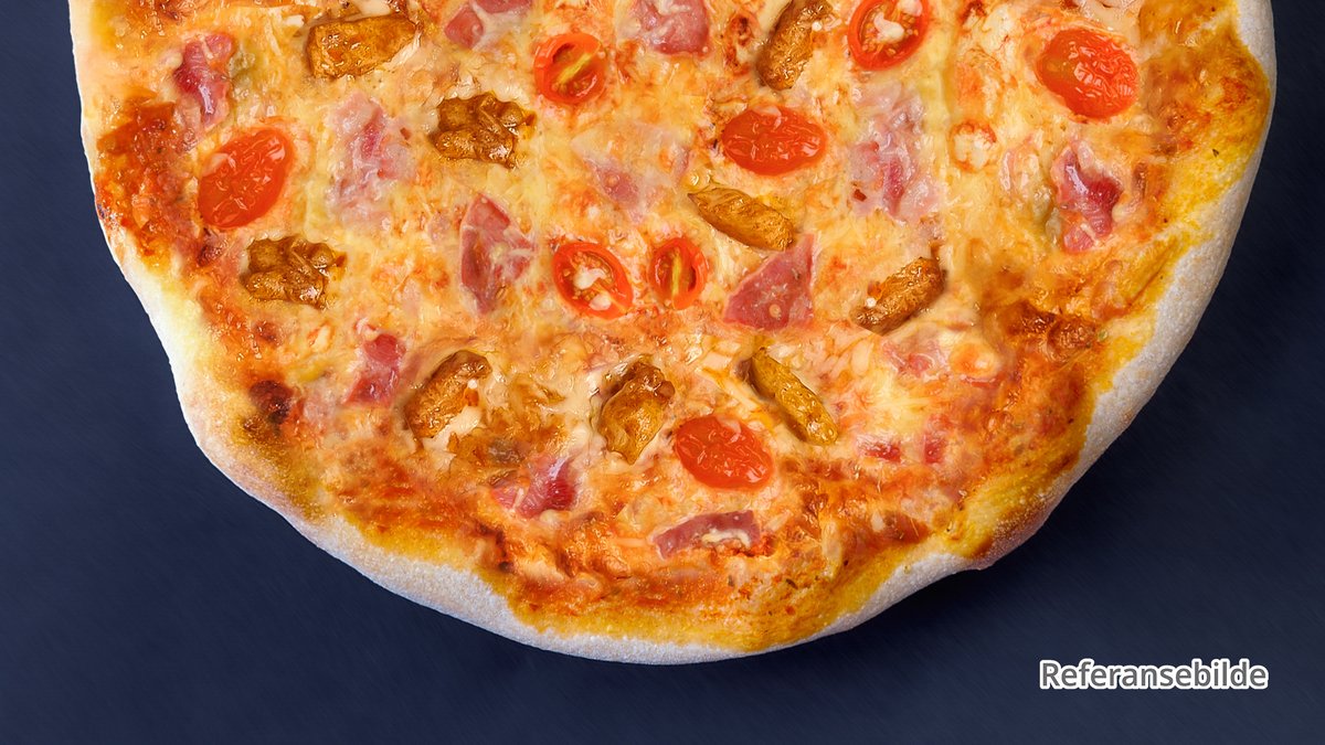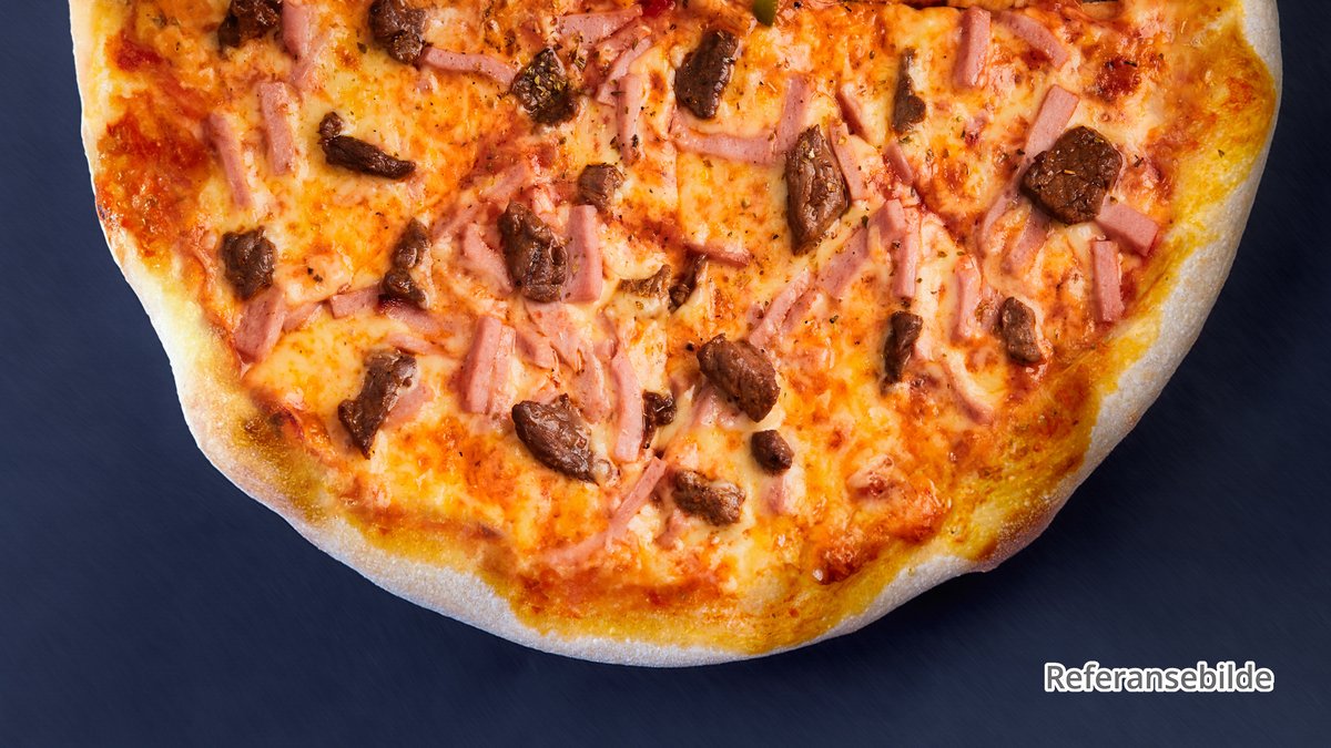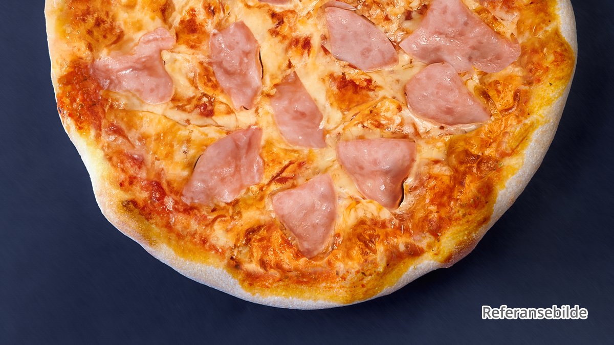 Pizza med tomatsaus og ost. Velg mellom skinke, pepperoni eller kjøttdeig.