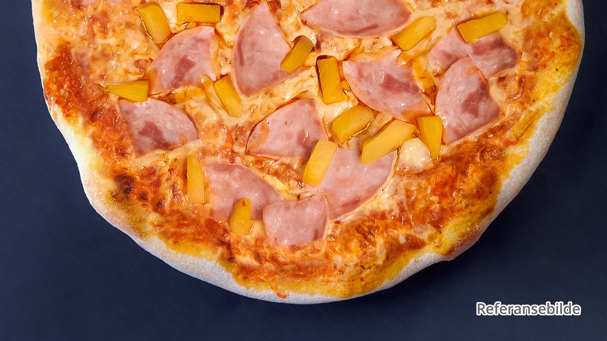 Pizza med tomatsaus, ost, biff, pepperoni og ananas.