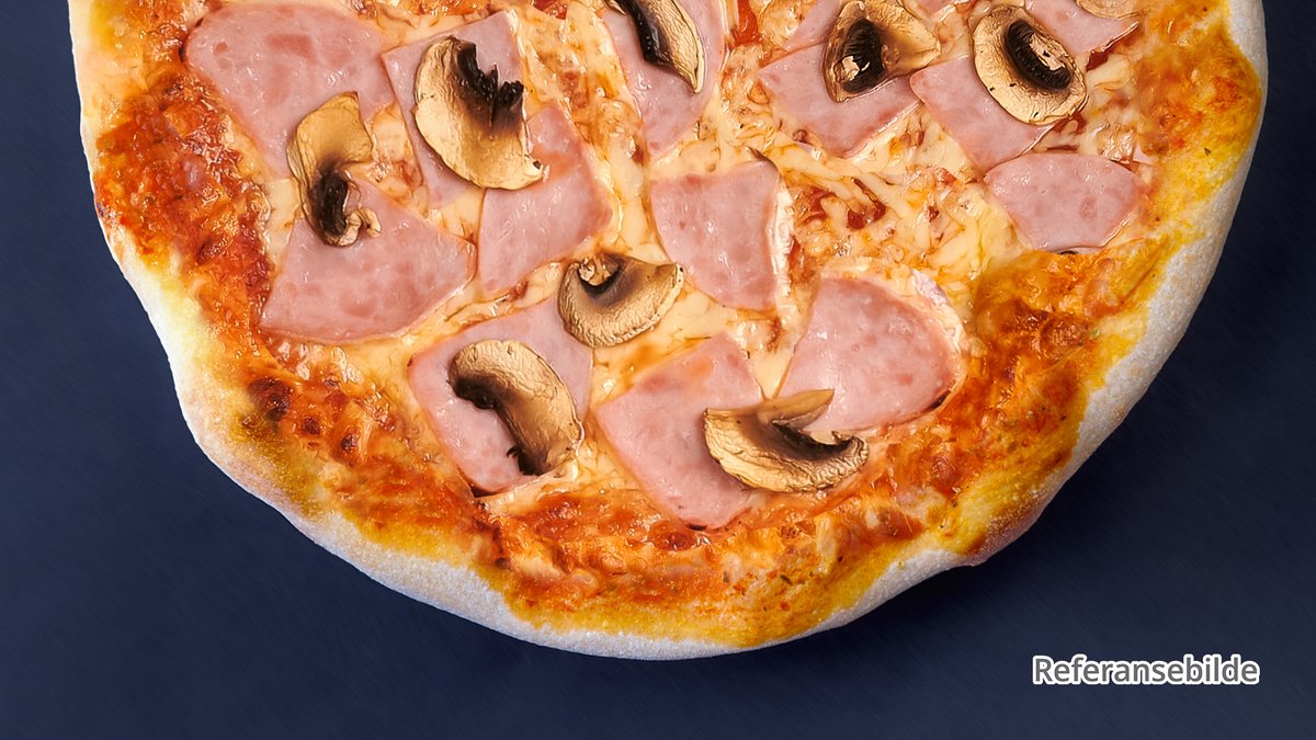 Pizza med tomatsaus, ost, skinke, fersk sjampinjong og oliven.