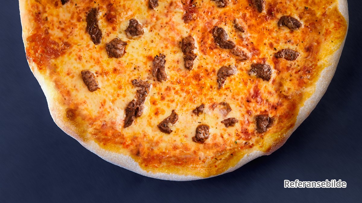 Pizza med tomatsaus, ost, biff, paprika, fersk champignon og løk. Sterk