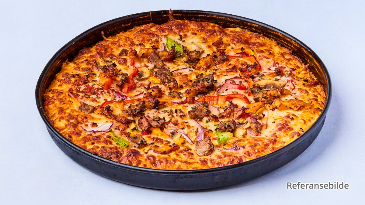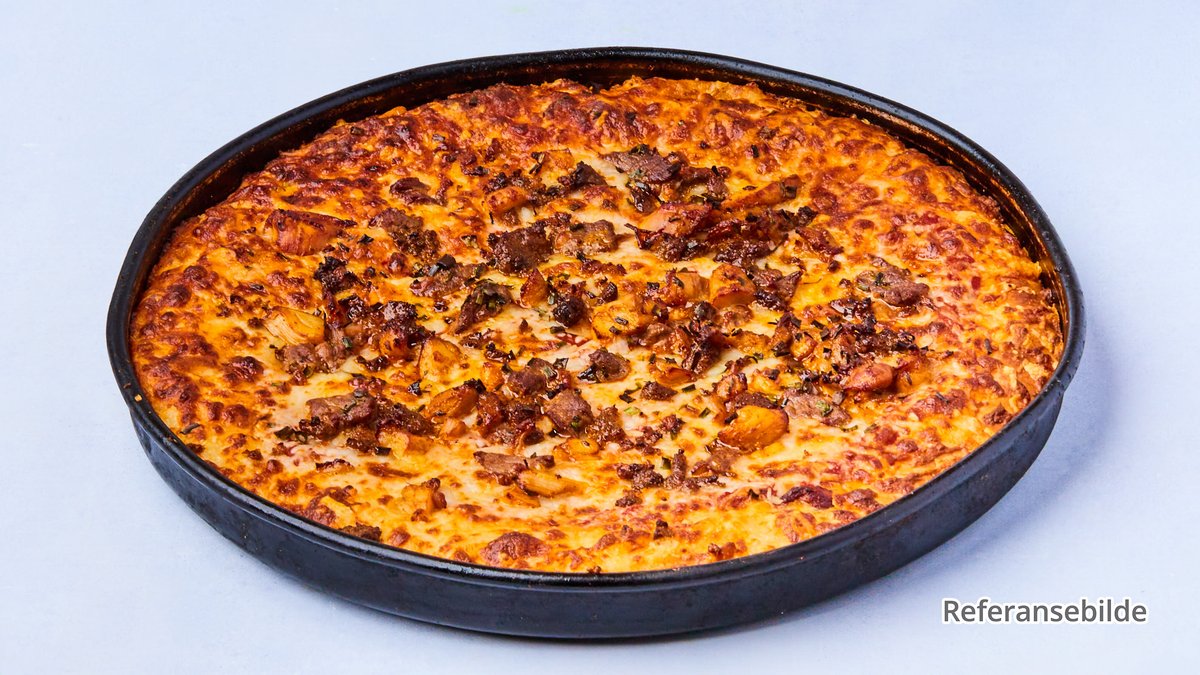 Pizza med tomatsaus, ost, kjøttsaus, pepperoni, biff, løk og champignon.