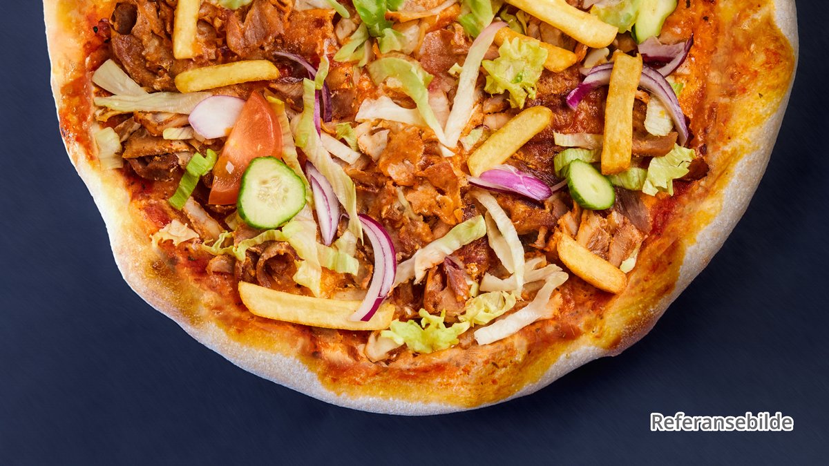Pizza med tomatsaus, ost, gyros, pepperoni, løk og tomat.