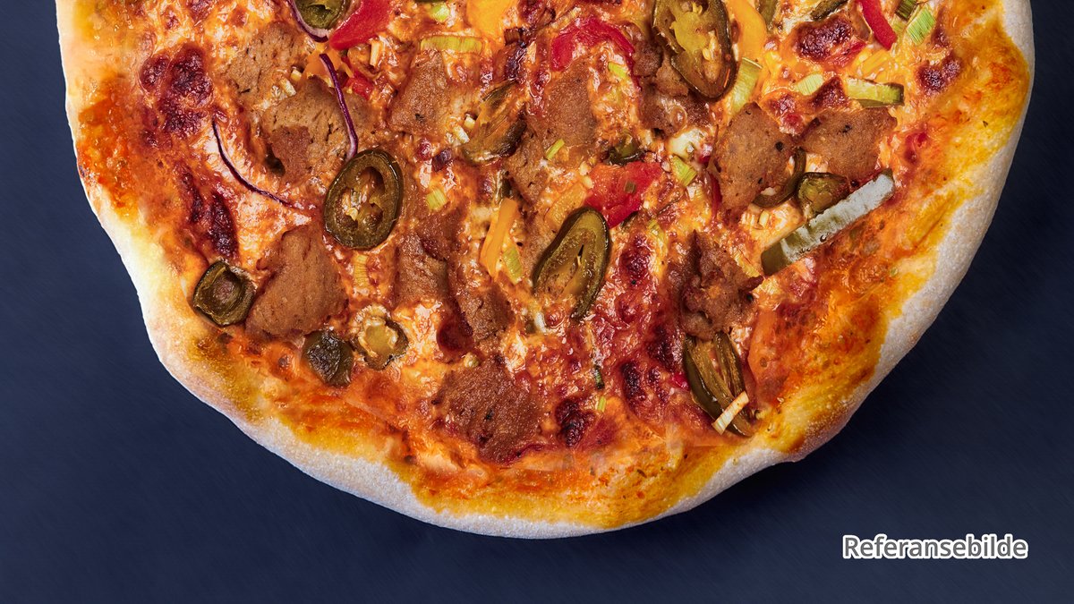 Tomatsaus, ost, biff, kylling, jalapeno, løk og paprika
