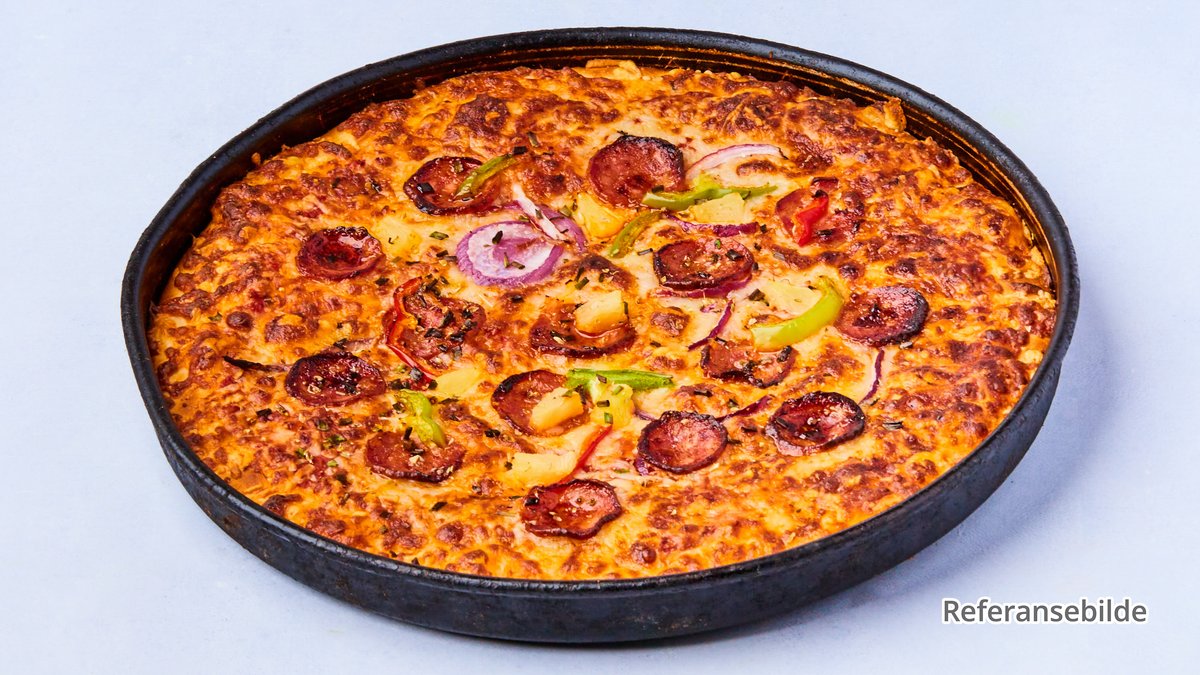 Pizza med tomatsaus, ost, pepperoni, ananas og løk.