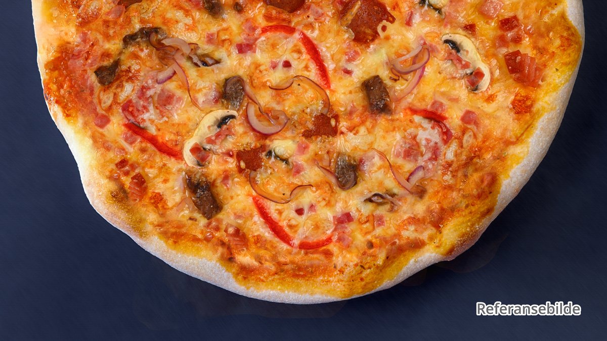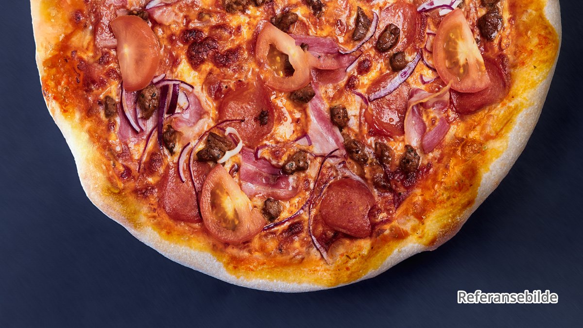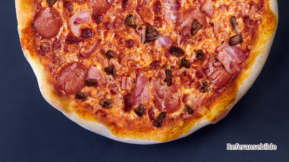Pizza med tomatsaus, ost, skinke, bacon og pepperoni.