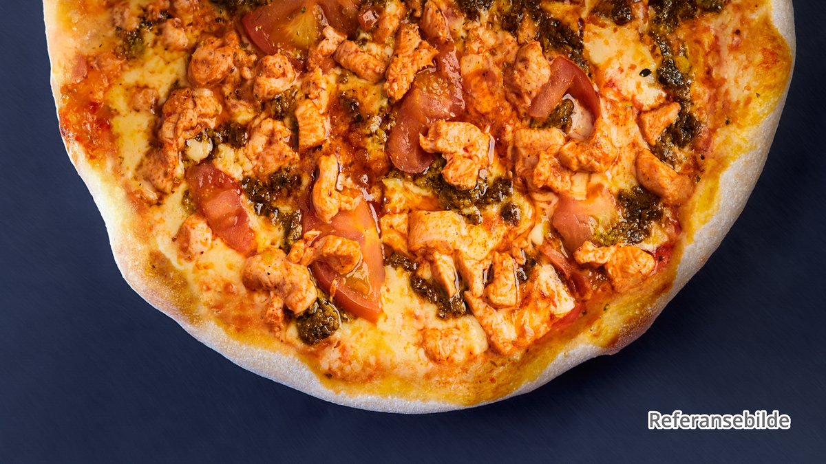 Pizza med tomatsaus, ost, kylling, pesto og ferske tomater.