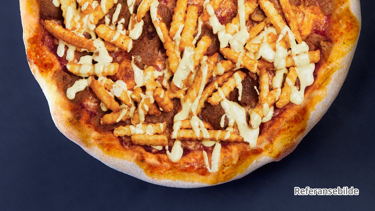 Pizza med tomatsaus, ost, gyros, pommes frites, salat og hvitløksdressing.