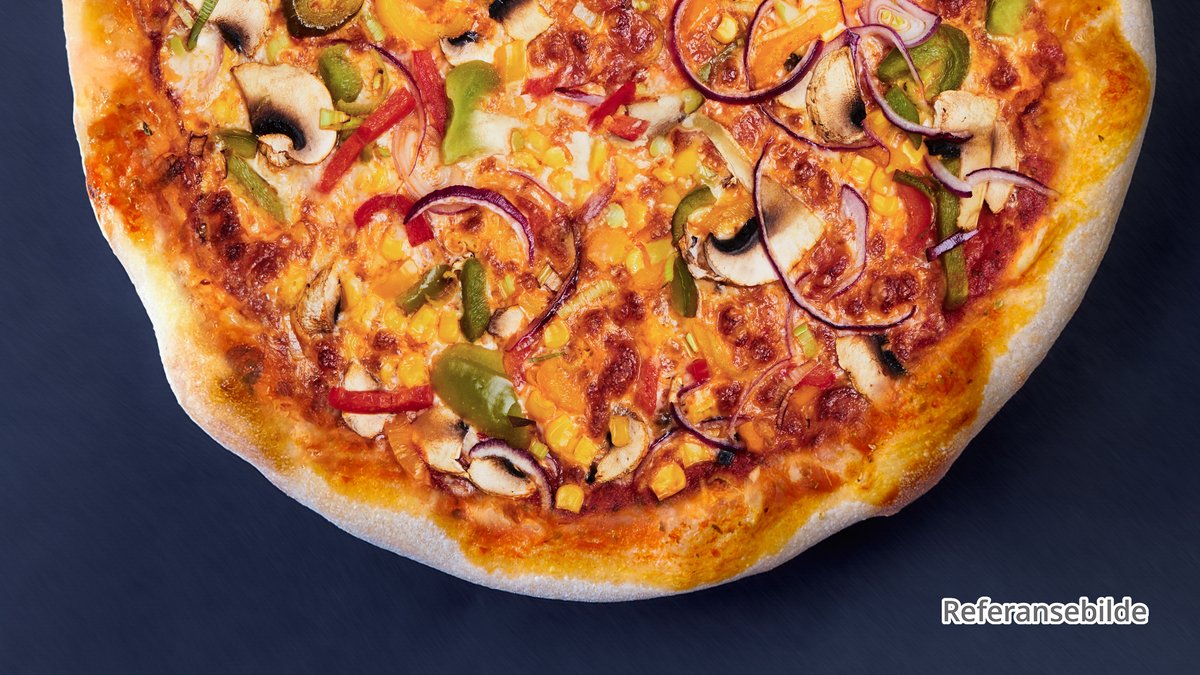 Pizza med tomatsaus, ost, løk, paprika, fersk tomat, fersk champignon, mais og oliven.
