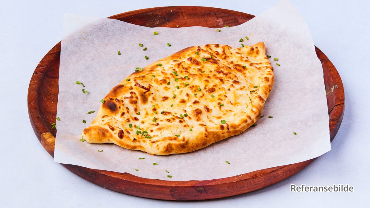 Innbakt pizza med tomatsaus, ost og lammekjøtt.