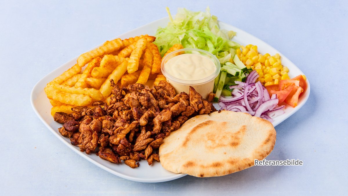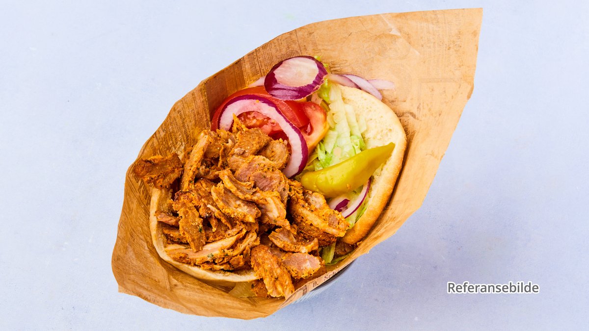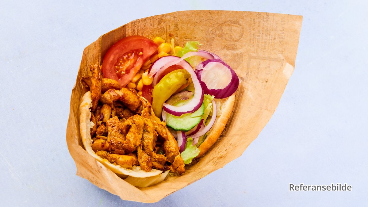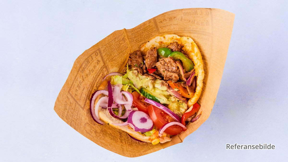 Kebab med gyroskjøtt, salat, tomat, agurk, løk og dressing.