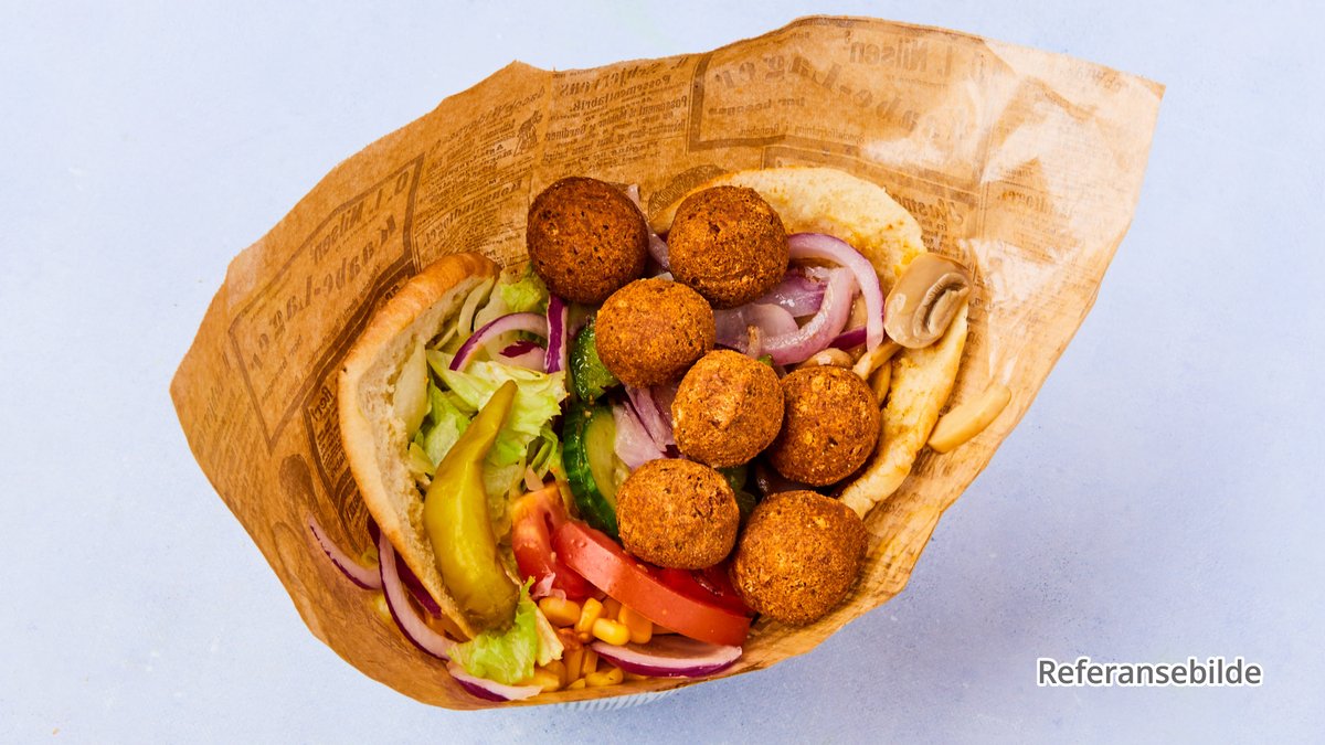Falafel kebab med salat, tomat, mais, agurk, løk og dressing.