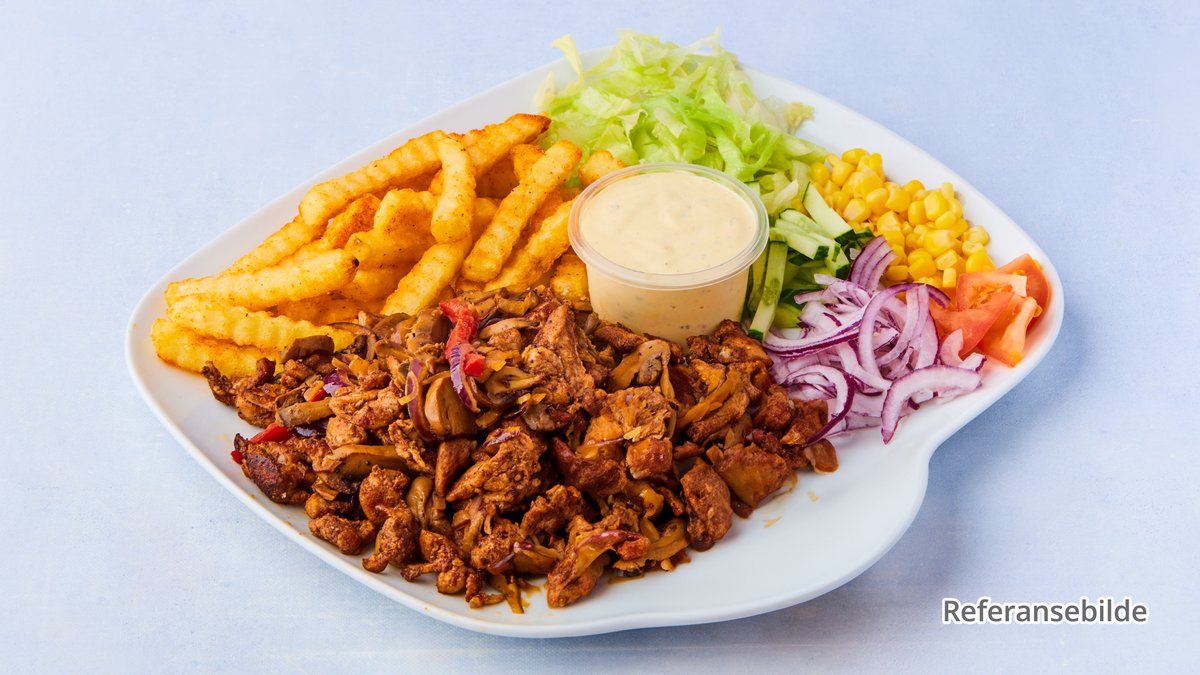 Biff med løk, fersk champignon, paprika, jalapeños og salat. Serveres med pommes frites og peppersaus.