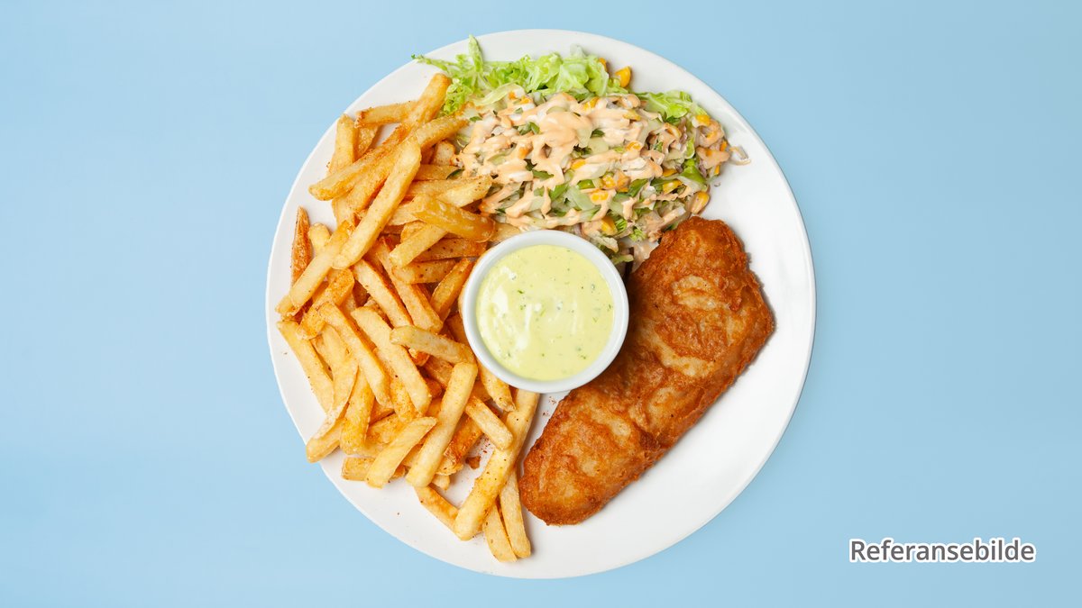 Fisk med remulade og salat. Velg mellom pommes frites eller søtpotet fries.