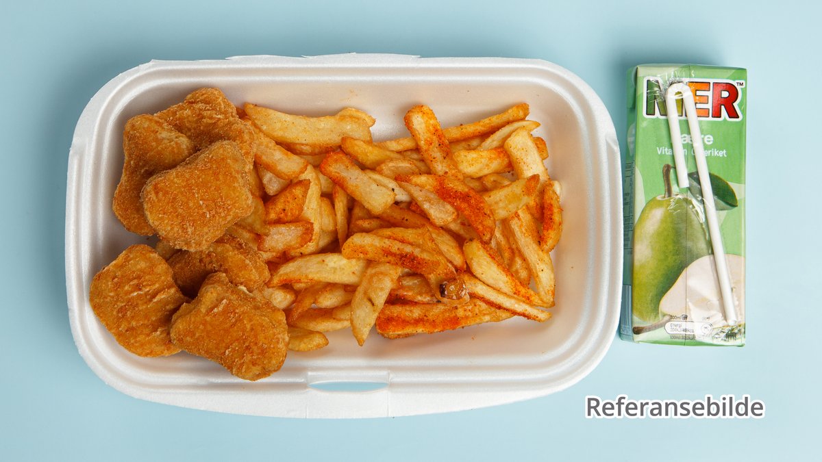 Kyllingburger med salat, tomat, rødløk og dressing. Serveres med pommes frites.