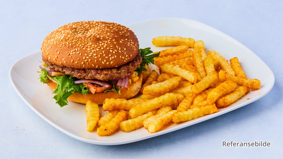 Vegetarburger med salat, tomat, rødløk og dressing. Serveres med pommes frites.
