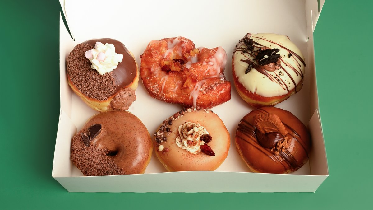 Donut fylt med Oreo cheesecake. Dyppet i hvit sjokolade. Toppet med sjokolademousse og knust Oreo.