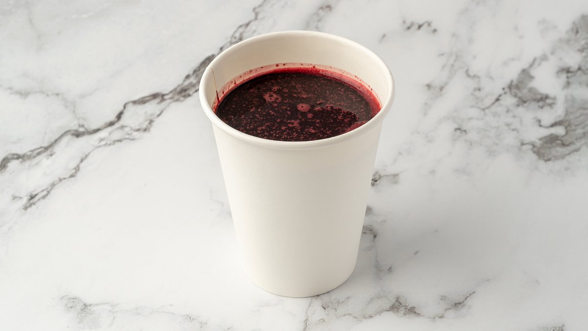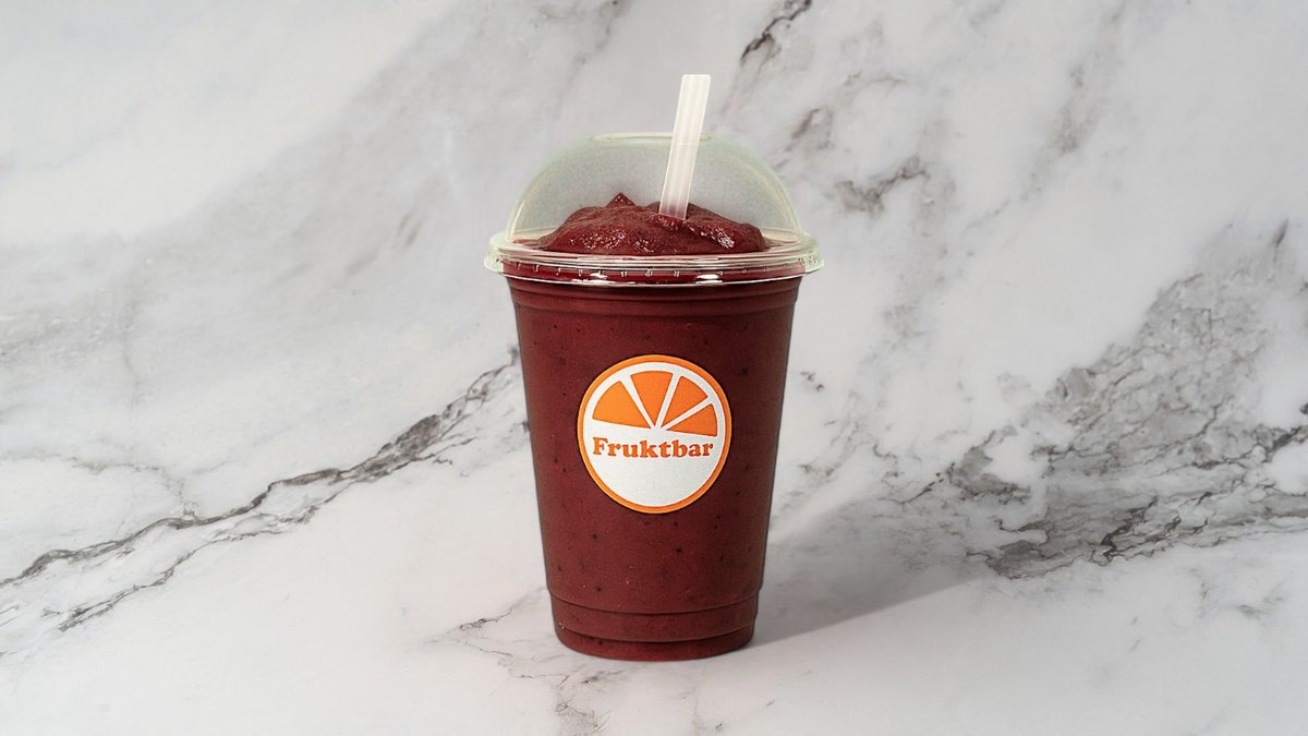 Acai, jordbær, blåbær, banan og eplejus. Smoothiene er laget med eplejuice som standard, og det er mulig å velge en melkevariant i tillegg.