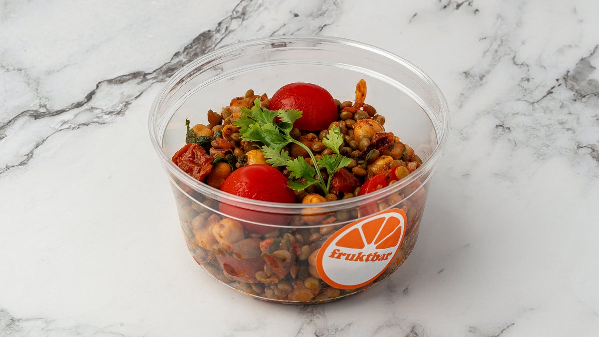 Proteinrik salat av linser, kikerter, tomater og koriander.