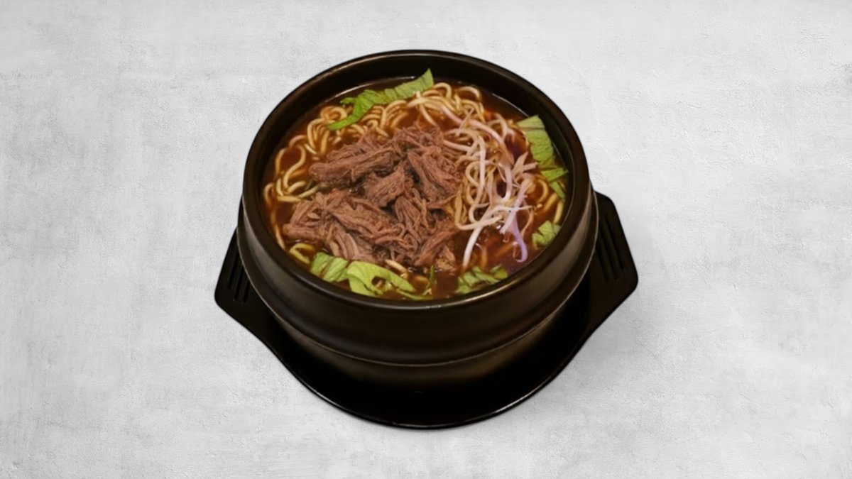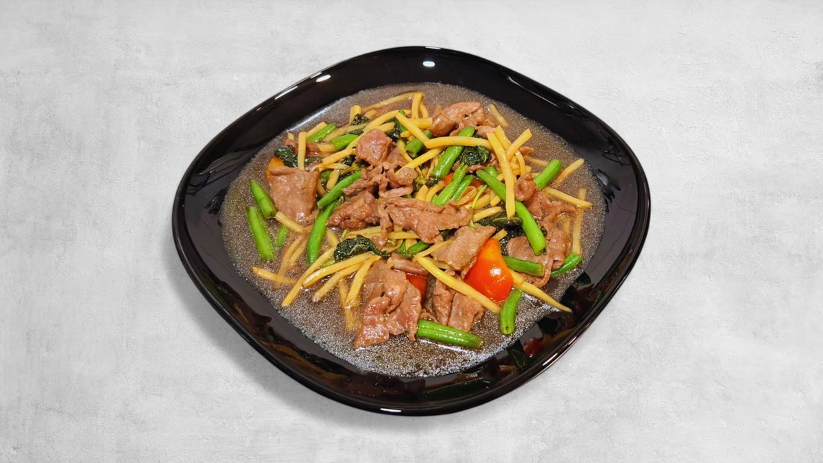 Kokosmelk, rød karri, papirka, bønner, basilikum, bambusskudd og ris. Kylling, biff eller scampi. (Det er litt sterk på grunn av karri)