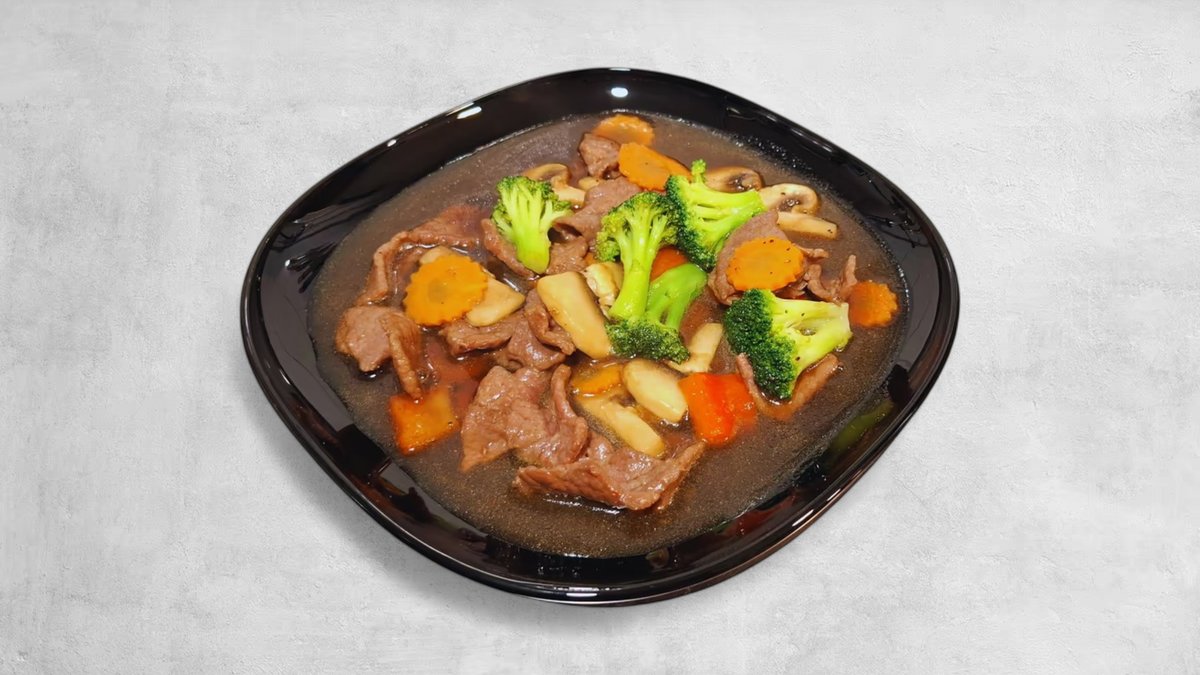 Kokosmelk, grønn karri, brokkoli, basilikum, papirka, bambusskudd og ris. Kylling, biff eller scampi. (Det er litt sterk på grunn av karri)