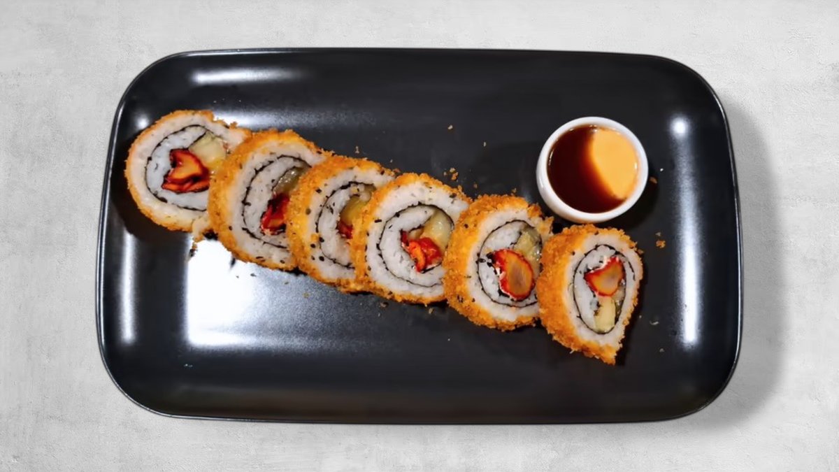 Tempura, jordbær, avokado, philadelphia og teriyakisaus. Severes med soya og syltet ingefær.