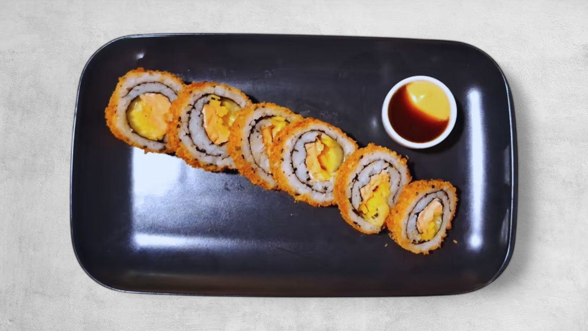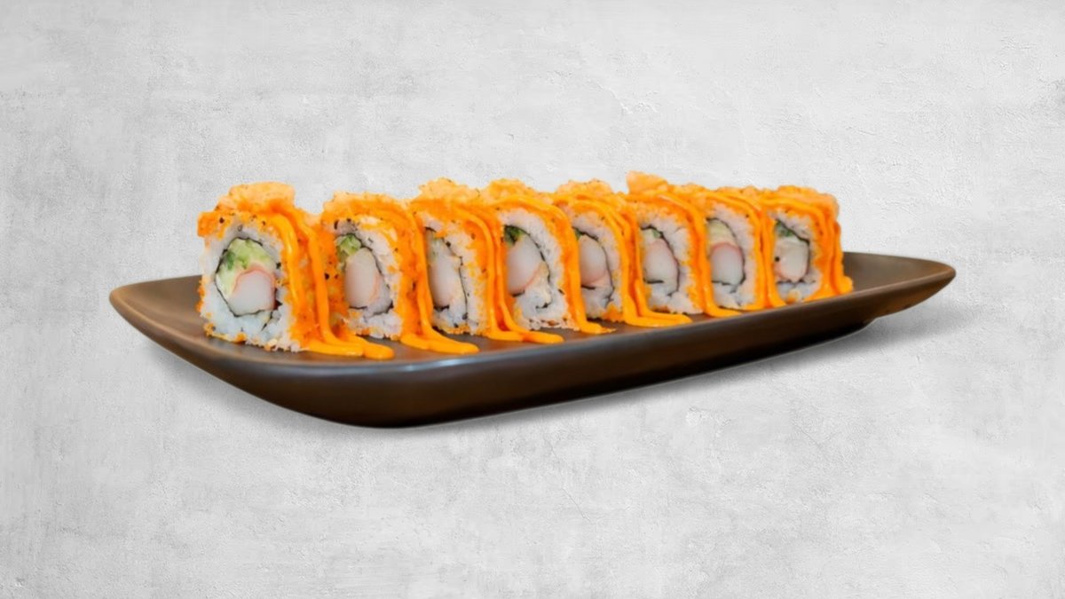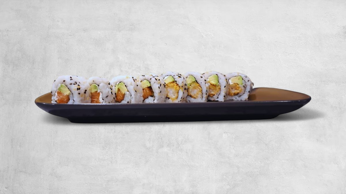 Tempura, laks, avokado, philadelphia, masago og chilimajones. Severes med soya og syltet ingefær.
